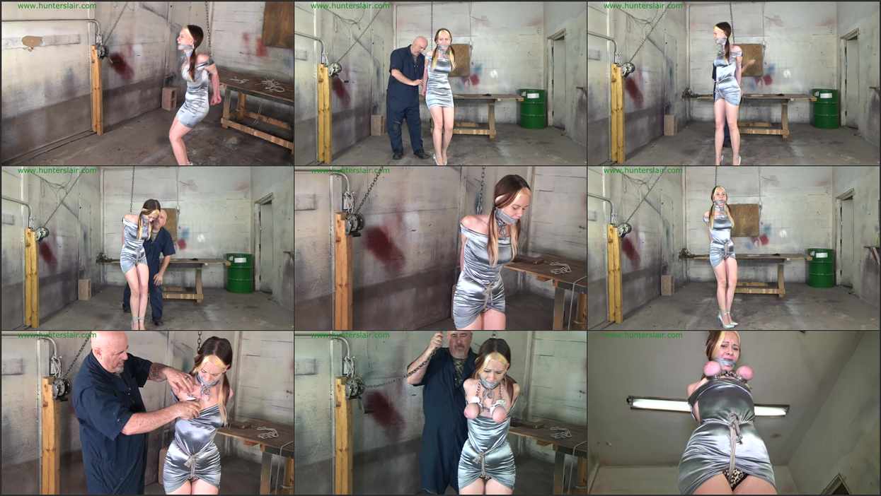 Pretty neighbor girl Lexi struggles at the end of a chain with her elbows crushed and bound tightly together behind her back. The chain that hangs down from an overhead pulley is attached to the ropes that fused her elbows completely together. Her pretty mouth has been packed and sealed shut with layers of duct tape wrapped around her head. She pulls desperately at the ropes then tries to pull on the chain with her flailing hands then attempts to reach the winch with her hands but it is just out of reach. The Hunter returns with more rope and ties her wrists tightly together. Then a rope is tied around her tiny waist and pulled down between her legs. The crotch rope is buried deep in her pretty satin panties then run up between her tightly bound wrists. The crotch rope is pulled tight, pinning her wrists to her ass before it is run back down between her legs and tied off at her belly. Then rope is wrapped around her slender ankles and cinched tight. Lexi is helpless to stop him from fondling her big tits as he pulls them out of her shiny satin dress. He grabs a set of leg shackles and wraps the cuffs around each of her breasts with the chain between the shackles run up behind her neck. The steel cuffs are clamped down around her tits causing them to swell and bulge…