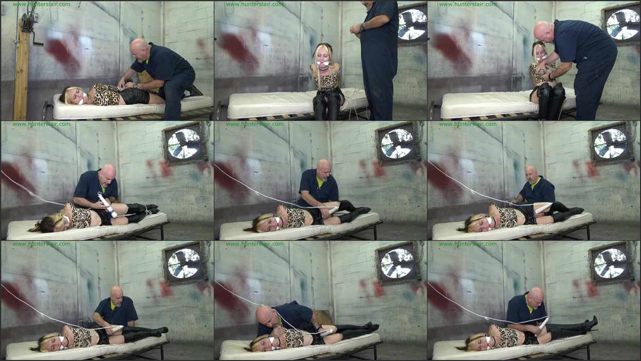 The Hunter pretty neighbr girl Lexi lies tightly hogtied on a cot in the lair awaiting the Hunter. Her elbows are welded tightly together like she likes it with her wrists and ankles tied and her booted ankles attached to her wrists. Elastic bandage has been pulled between her teeth to keep her quiet. She struggles helplessly on the cot testing her bonds satisfied to discover that she is completely helpless. The Hunter comes in with more rope and frees her legs from the hogtie. He sits up and then binds her big tits in a tourniquet of rope over her tiny leopard crop top. Lexi’s big tits swell and bulge like balloons stretching the fabric of her crop top. He then plugs in a wand vibrator and presses it against her pussy under her tiny leather mini skirt. Lexi moans in pleasure into her gag as the vibrator begins to stimulate her pussy. The Hunter unties her ankles to allow her to spread her legs and enjoy the vibrator. Lexi pulls at the ropes crushing her elbows together which gets her even wetter along with the strict breast bondage she can feel her first orgasm build up inside her. Lexi moans in pleasure as her first orgasm explodes in her pussy. Lexi has a few more orgasms as she struggles in the rope before the Hunter pulls the stuffing out of her mouth. He leaves the cleave gag in place and as well as the ropes binding her tits and arms and leaves her to drift off in subspace totally exhausted.