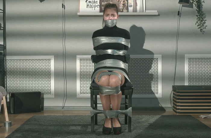 As she tries to call the police, a masked rigger suddenly attacks and restrains her with tape. Her wrists and elbows are taped tightly behind her back, her legs are bound in multiple places, and her mouth is sealed, leaving her struggling helplessly on the floor while he reports to his boss.