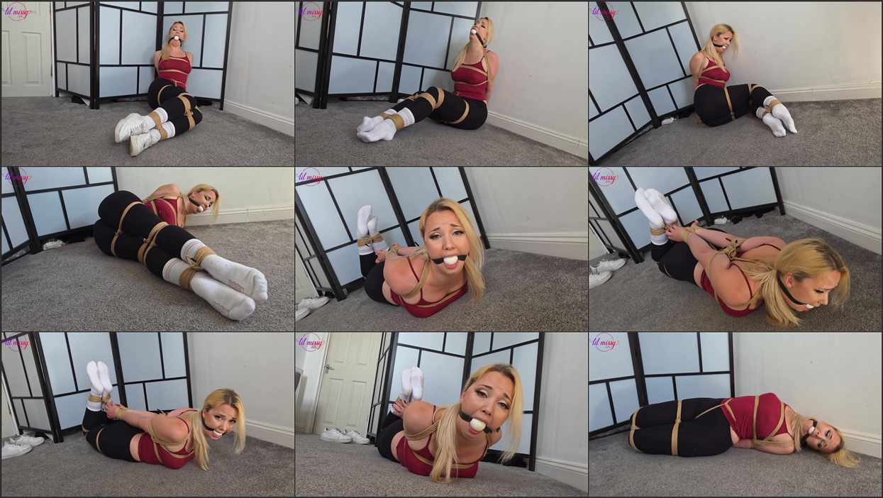 After a couple of minutes of struggling on the floor, I kick off my shoes and begin to wiggle my cute socked feet. I go from sitting down to lying on the floor, and you can see closeups of my feet, crotch and gagged face. There’s lots of whimpering through my gag and big pleading eyes as I try to get free.