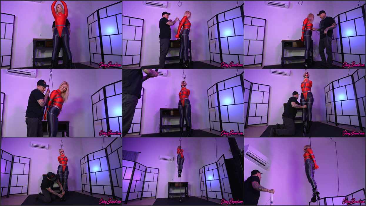 The silky red leotard and silver leggings she wore hugged her curves, making her appear like a shimmering superheroine doll as Shiny added more ropes, banding her body at the chest, waist and hips. Her legs were pulled together and pinned closed with more rope that wound between her thighs.