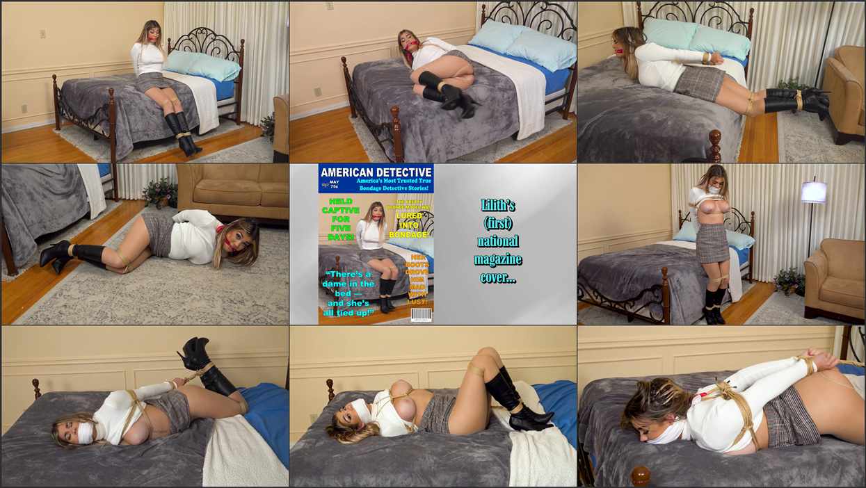 Lilith’s gag is removed and her turtleneck sweater is pulled up to expose her considerable breasts. She questions how she can be shown topless on a national magazine cover, but she quickly figures it out: Her next national cover will be for an adults-only bondage magazine. The busty babe is re-gagged, this time with a detective gag knotted over her bandana cleavegag, and she struggles like a pro for the camera. Then the brown-eyed beauty is hogtied on the bed, and she continues her outstanding damsel performance. Although Lilith seemed to be a little unsure at the start of the photo session, her response at the end of the scene confirms she’s absolutely delighted to be a bondage covergirl.