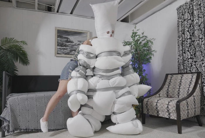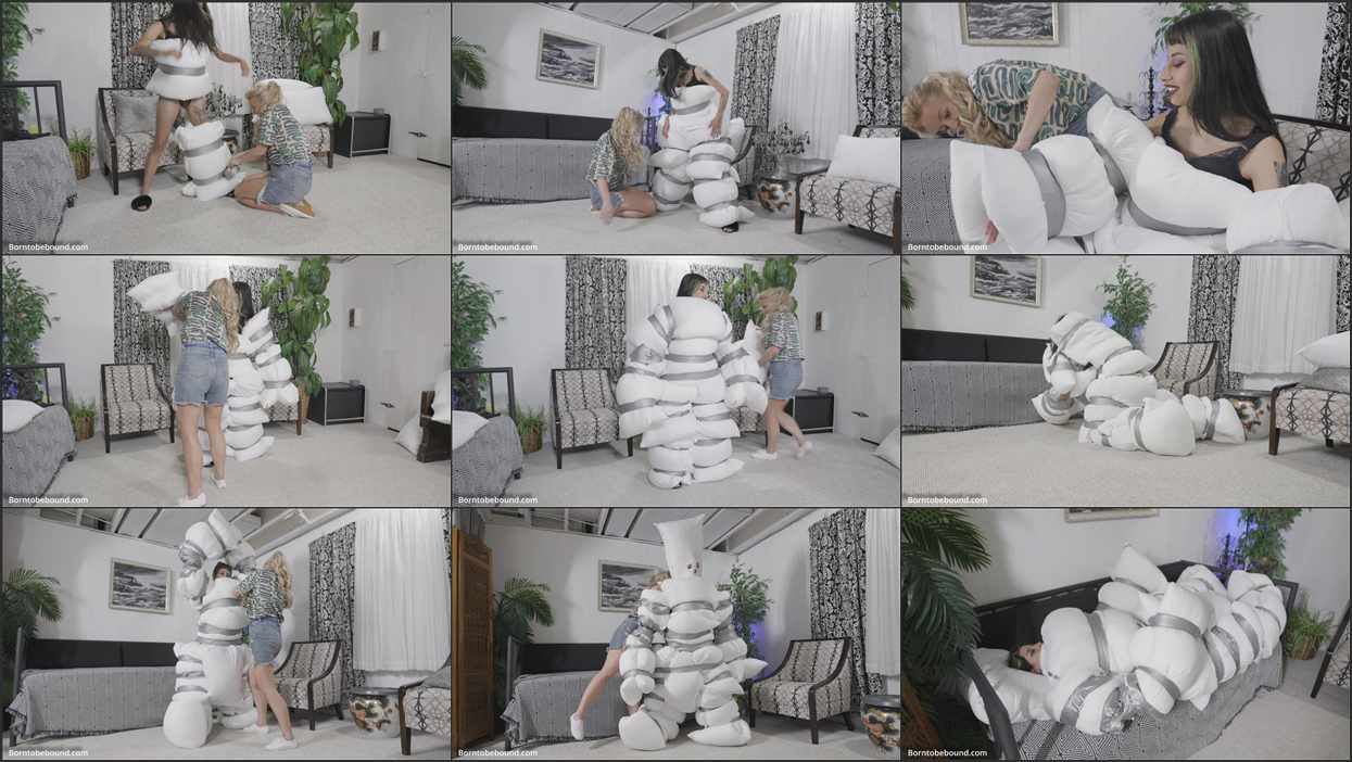Lilith complains about her mattress being so uncomfortable that she can’t sleep at night. Her friend JJ claims to have the perfect solution. Lilith can turn into her own mattress with help from a couple dozen pillows and duct tape! Knowing it was going to get hot Lilith strips down to her bra and panties and we get to work nerfing her up! There is lots of laughter and chatter.