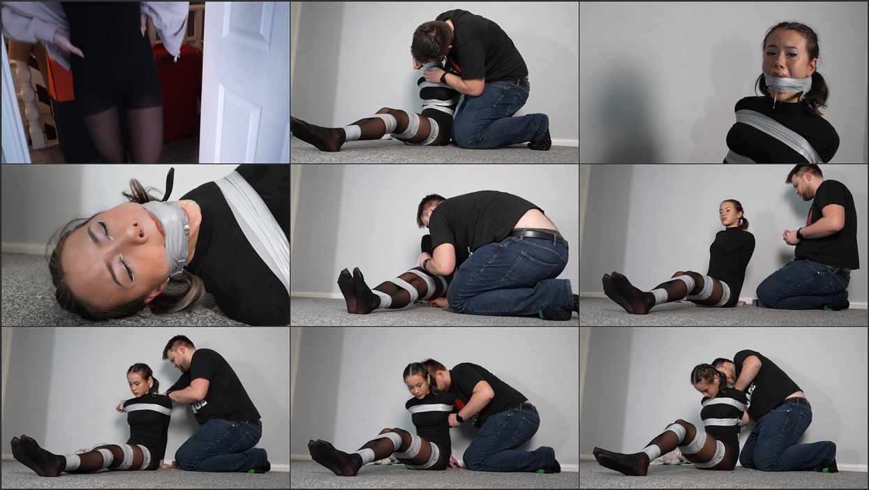 Lilly is a secret police officer, she decided to play dirty and brake into the house of known bad guy. She snoops around the house, until she comes upstairs and enters the bedroom where someone is waiting for her already. The bad guy handbags her, grabs some tape and ties her up. Then he uses a giant ball gag to deeply gag her, and he uses tape over the gag to secure it even deeper and more secure.