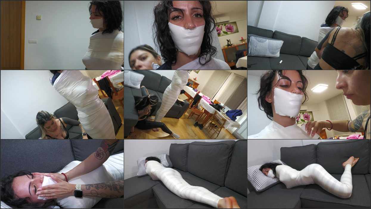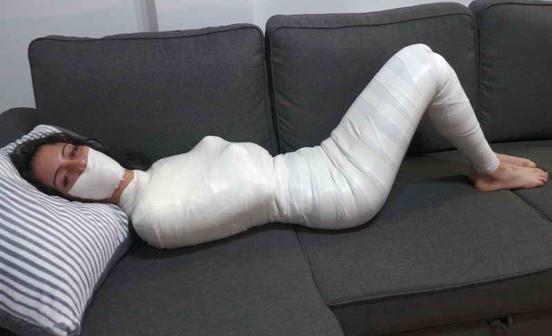 Persefone is resting in her couch when she feels its cold, so she decides to put her arms inside her shirt to warm her up. That’s the moment Liricaa the burglar decides to act! She gags her with a piece of microfoam. Persefone tries to run but she holds her with a white cloth. Then she starts to mummify her with microfoam. Liricaa takes her time to properly mummify her victim and making sure she’s not going anywhere. It’s so tight! You can even see the shape of her fingers through the microfoam. When Liricaa is done, she puts her in the couch and leaves for the money. Persefone is left there tied up and gagged, totally helpless! She struggles trying to escape but is completely impossible. She’s gonna be there mummified for a while! “MMMMMMMMMMMPPPPPPPPPPPPPHHHHHHHHHH!!!!!!!!!”.