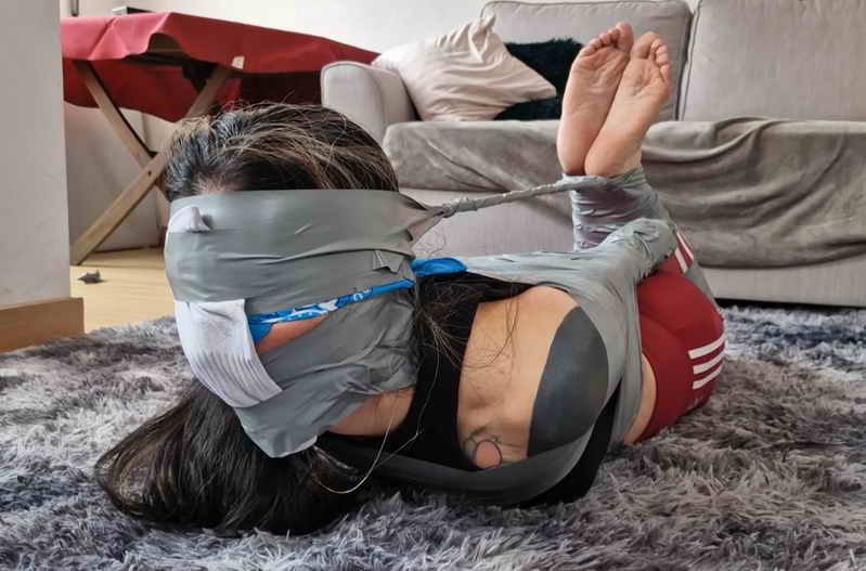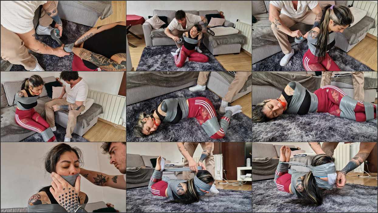 Liricaa complains but Speakuss has a firm hold on her, so the keeps going tying her whole upper body. Liricaa complains all the way and Speakuss gets fed up, so he grabs a ballgag and stuffs it inside Liricaa’s mouth. He then keeps tying her legs in really tight tape.
