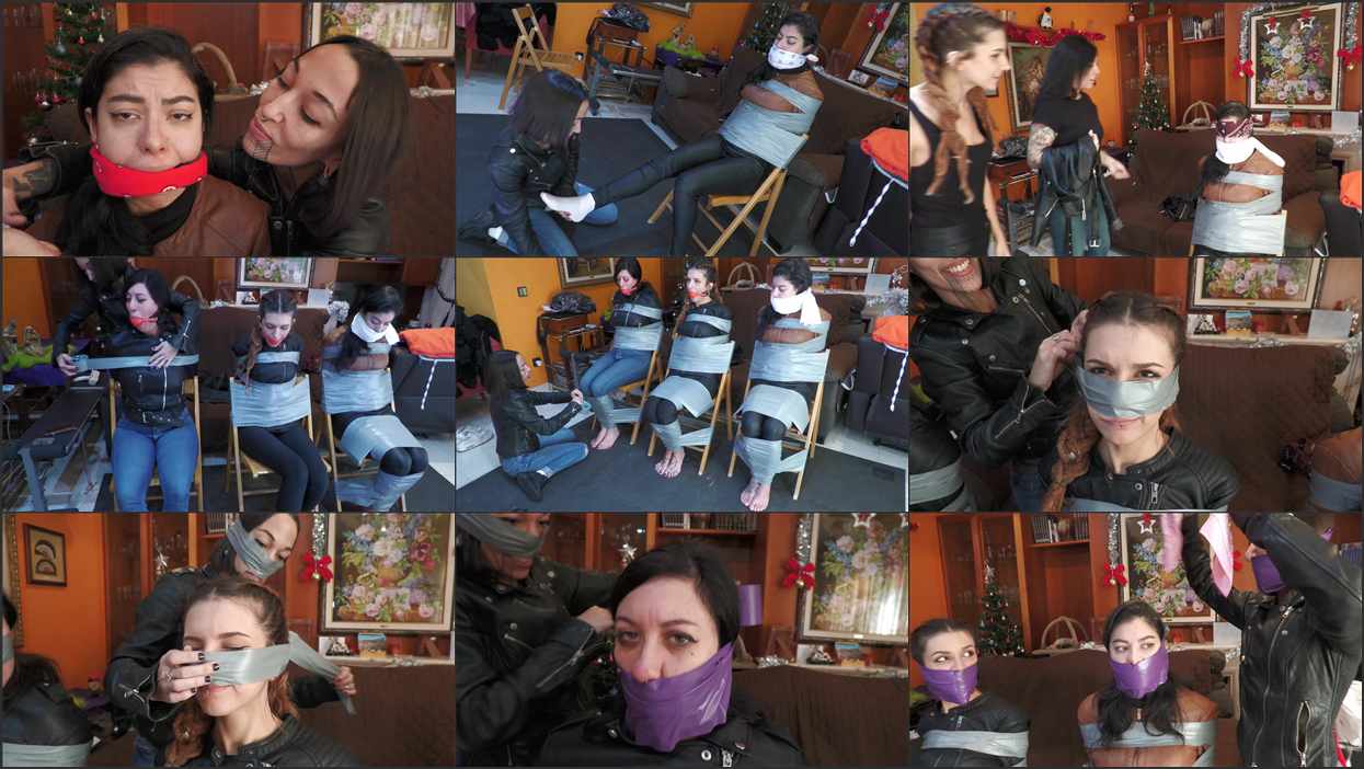 This was a custom video! Contact us to order your own custom video too! Liricaa is a kinky freak who loves leather jackets. She finds Pilu’s leather jacket and starts playing with it. When Pilu finds her, she gets mad, and grabs Liricaa and handgags her. Pilu is tired of Liricaa always stealing her jackets and doing weird things with them. She gags her with panties and two cleavegags. Then she also adds an OTM gag. Pilu ties Liricaa to the chair using a lot of tape. Then she adds another OTM, and after that she blindfolds her! But then She hears a noise and hides. Tenjou and Dyanne arrive and find Liricaa tied up and gagged. They remove the blindfold and ask Liricaa whats going on. “MMMMMMMMMMPPPPPPPPPPPHHHHHHHHHHH!!!!!!!!!”. The girls just think this is one of Liricaa’s kinky things and sit on the couch. Then they find Pilu’s leatherjacket and start to play with it. Then Pilu arrives and also gets mad at them! She makes the girls to gag themselves with ballgags and then she ties them to a chair too. Pilu remove their gags, and puts tape on their noses. Then she removes the tape and proceeds to gag all the girls with a huge gag. She gags all three with their own socks and a big 100mm tapegag. Then she also gags herself with her socks and a big 100mm tapegag too. Then Pilu takes her leatherjacket and makes sure the girls understand its her jacket and she doesn’t like people to touch her things. Pilu blindfolds the three of them. Pilu sits there with her leather jacket while the girls are there tied up and gagged, totally helpless!