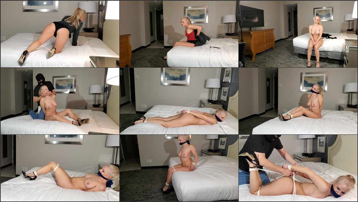 Detective Liz Ashley received a tip on the Masked Intruder’s where-abouts and goes to investigate – dressed in a sexy shorts and blazer, the blonde detective looks for clues but only discovers a TRAP !! The Masked Intruder lured her to the location and now Liz Ashley must strip out of her clothes – naked, except her high heels, Liz is tied up and panty gagged – struggling and moaning, shr shakes her all natural titties as she tries to loosen the ropes that bind her. She even makes a daring escape attempt, hopping her nude body toward the door, but the Masked Intruder easily re-captures the feisty damsel and secures Det. Ashley into a hogtie – once again the sexy blonde detective has been defeated, but Liz Ashley will never give up !!