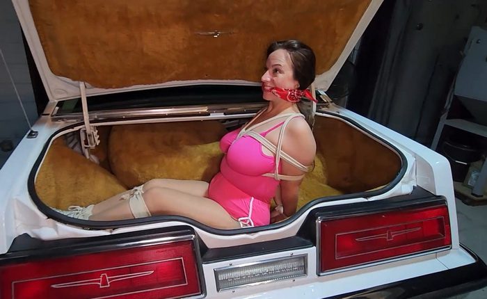 Liz River, clad in pink shorts, a matching vest, and white roller skates, lies restrained in the trunk of a 1979 Ford Thunderbird at the mercy of the driver, Ben. Liz’s wrists and ankles are secured with expert rope work, leaving her immobilized on the plush orange carpet of the vintage interior, forced into an uncomfortable, predicament of position.