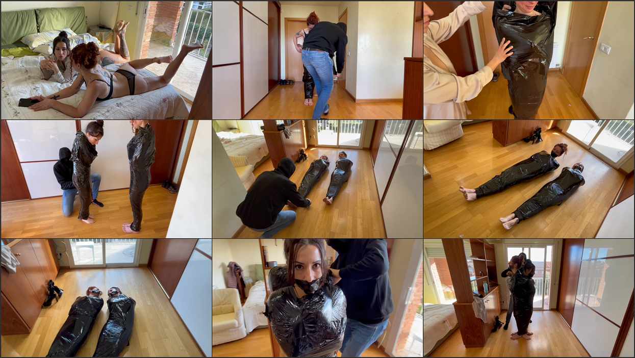He arrives and carefully begins the process, wrapping Lola first, until she is fully immobilized. Laura watches with anticipation as her turn comes next, surrendering herself to the same meticulous mummification. In the final stage, both women are brought together and bound as one in an intense double mummification, unable to move and fully enveloped.