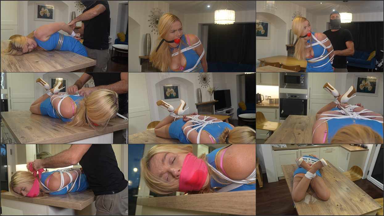 After checking that she hasn’t forgotten anything, she’s about to leave when a masked man suddenly appears behind her and grabs her roughly. Where did he come from? The garden? Before she can even think, she’s taken to the kitchen and her hands are quickly tied. Her torso is also bound, her ample breasts stretched taut between the ropes. She can’t help but speak and moan. The solution? A huge gag in her mouth to silence her! “MMmmGGGRRRRRRRffffggggnnn!” she exclaims. Her fury is understandable: if she can’t free herself, she won’t be able to go to work and will be fired! She’s sacrificed everything for this.