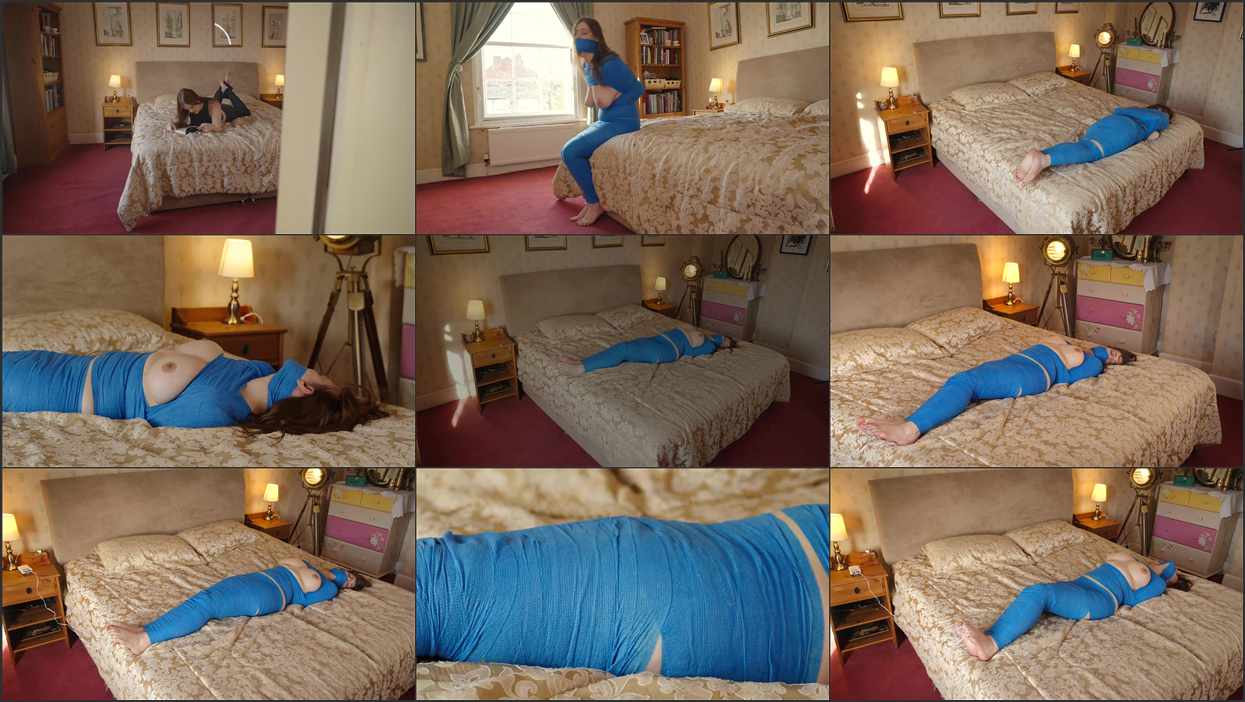 Amazing buxom babe Lottii Rose is chilling on her bed reading when an intruder bursts in! She is soon wrapped from neck to ankle in tight smothering blue vet wrap, mummified and helpless, her moans and cries muffled by more vet wrap over her mouth. The intruder perves over her struggles and kicks, of course he’s left her big natural boobs free to bounce with every kick, and her feet free too so he can ogle her soles. When she runs out of steam he wires her up to a TENS unit, one electrode on each sole, and zaps her to encourage continuing jiggles!