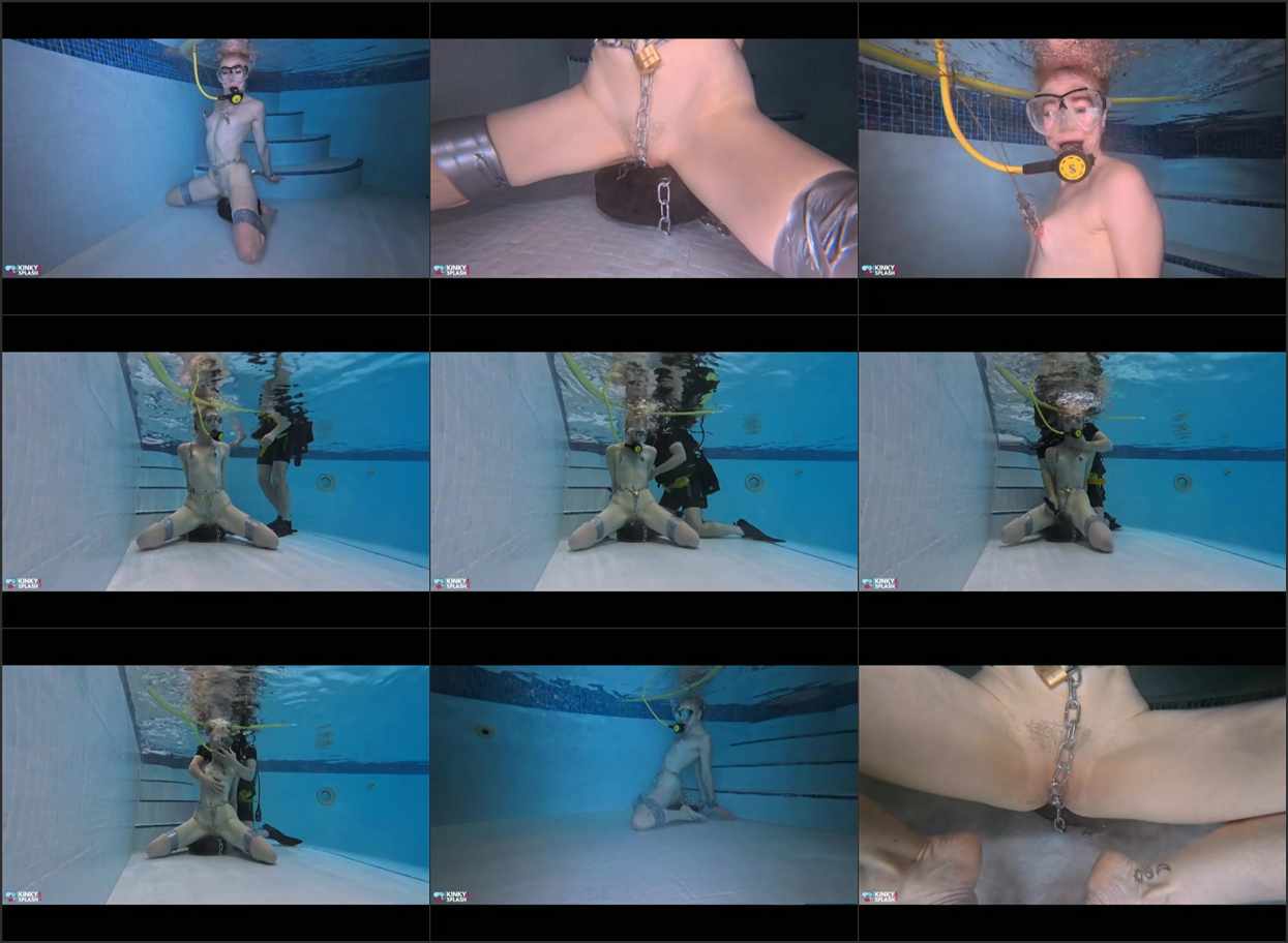 I’m equipped with a split-screen dive mask and BCD, breathing steadily as I await what’s to come. A dominant man enters in full scuba gear. He wastes no time—pulling harshly on the crotch chain and nipple clamps, intensifying the pressure and pain. He presses me tightly against him, holding me in place as he applies a powerful vibrator to my pussy. Unable to resist or escape, I’m made to surrender to an intense underwater orgasm.