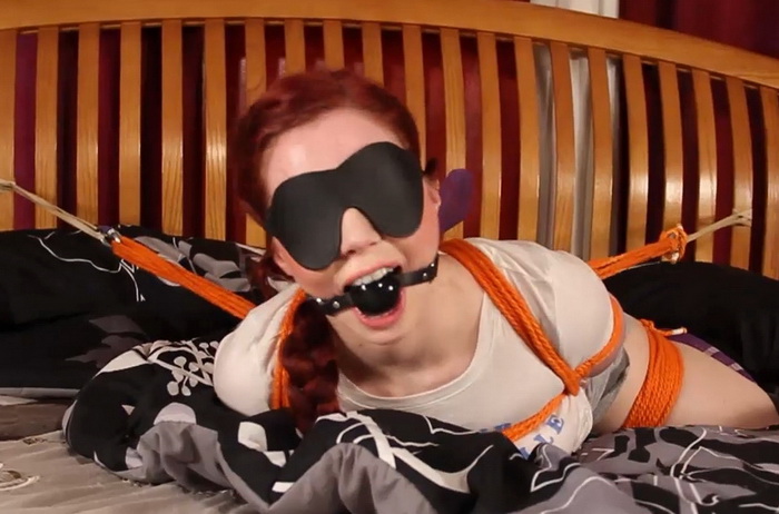 When I told Ludella that in addition to tying her up, I could give her a workout she was a bit skeptical. Getting tied up and not feeling guilty about skipping the gym must have been too tempting however. With her bound in plenty of orange rope I pulled out my secret weapon; some heavy rubber bands. Secured to the headboard Ludella’s objective is simple. The workout is over when she can either reach the scissors or break the bands. It’s not long before this whole body workout gets her sweating. After adding her gag and blindfold I think she might be wishing she picked the gym!