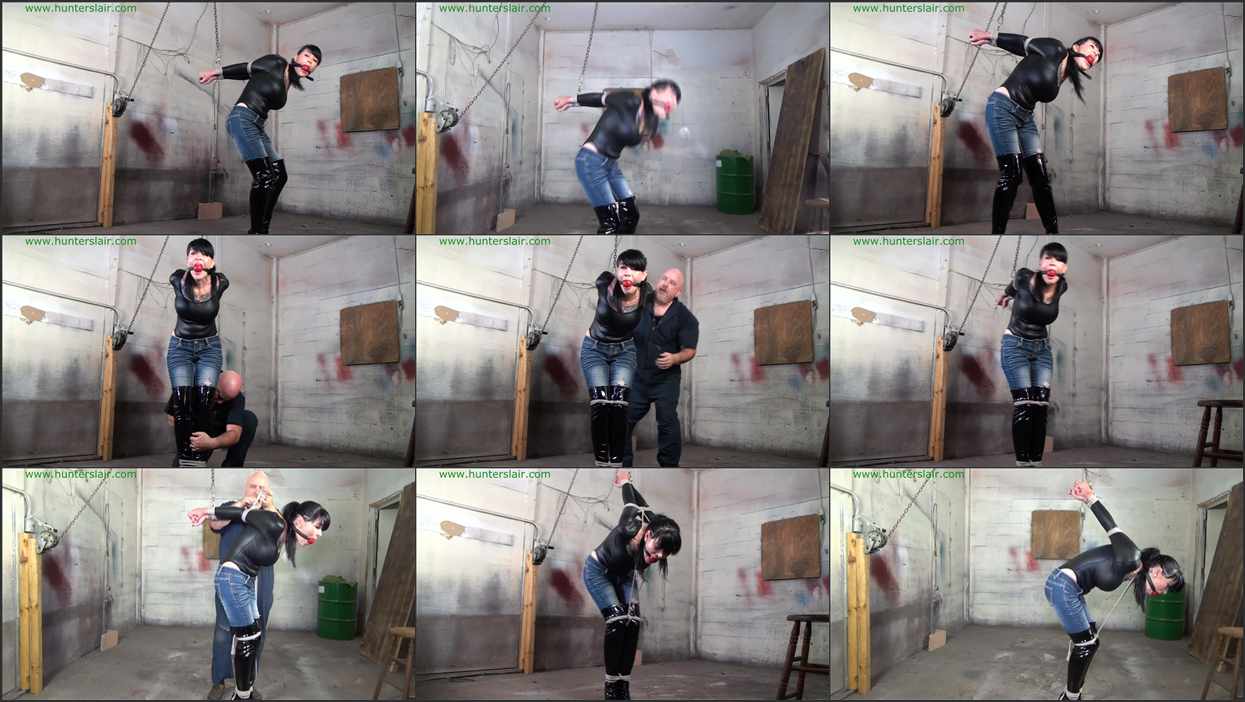 Busty MILF Luna struggles in the lair with her arms fused together behind her back in ropes. Her elbows are crushed and her bound wrists tethered to a chain hanging down from an overhead pulley. She stuggles desperately at the end of the chain, twisting, turning and kicking but there is no escape. The Hunter comes in with more rope and cranks her wrists up higher behind her back then ties her booted ankles and knees tightly together. He leaves poor Luna struggling in the bondage, her poor shoulders twisted painfully in their sockets. But the Hunter isn’t finished with her, he grabs more ropes and ties the end of the rope to her bound crushed elbows. Then running the rope over her shoulders and down to her bound knees. He pulls her chest down to her knees twisting her poor shoulders even higher behind her back. He leaves her alone to struggle and suffer in the cruel bondage.
