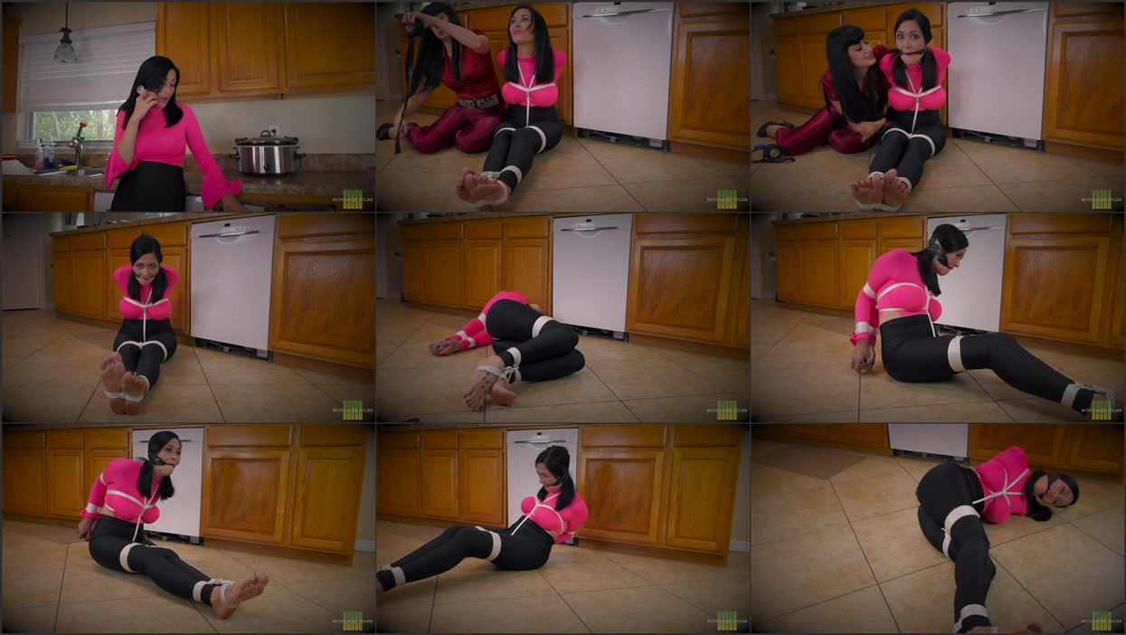 Luna Dawn has been having an affair with Nyxon’s husband, and as she’s bragging about it into the phone, Nyxon sneaks into her house & places her hand over her mouth. The next scene opens up with Luna tied up on the floor, and Nyxon giving her a tight cleave tapegag using 2 inch black electrical tape. Luna struggles on the floor while showing off her dirty bare feet.