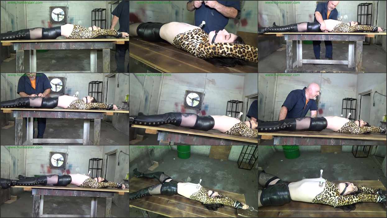 Slutty goth girl Lydia finds herself restrained on the Hunter’s table in leather cuffs. Her wrists are bound in thick leather cuffs, pulled over her head and attached to a chain running up to a winch. Her booted legs are spread wide apart with her booted ankles cuffed to the sides of the table. A ball gag is jammed between her teeth to keep her quiet. She struggles helplessly on the table but there is no way to free herself from the tight leather cuffs. The Hunter comes in and cranks the winch above her head, stretching her body taut across the table. He pulls her crop top up to expose her small breast and large nipples then attaches a set of nipple vacuum tubes to her breasts. Lydia bites down on her gag as the air is sucked out of the vacuum tube which sucks and stretches her nipples into the tubes. Then her ties a leather cord around her waist and down between her legs. The head of a wand vibrator is then tied up tight against her pussy. The Hunter then turns on the vibrator and leaves her squirming helplessly on the table as the vibrator begins to stimulate her pussy. Lydia bites down on her gag and pulls desperately at her leather restraints, but she can barely move. She can feel an orgasm building up deep inside her cunt as the vibrator over stimulates her clit and pussy. Lydia’s whole body tenses up, her back arches and her eyes roll back in her head as her orgasm explodes in her pussy. Her orgasm subsides but the vibrator is still working on her pussy and there is nothing she can do about it.