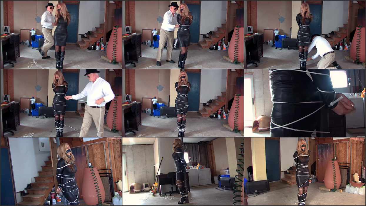Leather-clad Madison has been taken and tied to a pole in a basement. Her wrists and ankles are secured with zip ties so there is no possibility of escape. She starts protesting, demanding that her captor let her go, but he soon silences her with a piece of duct tape. To add to Madison’s discomfort, she has a collar around her neck which is attached via another zip tie to the pole, preventing her from bending forward. She may already be immobilized, but that does not stop her captor coiling rope around her body, from head to foot. Now she can hardly move at all as we view her from different angles, standing there trapped and helpless.