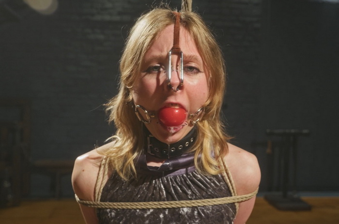 Her face is accented with a deep red ballgag stretching her lips, while a nosehook adds that extra edge and vulnerability. Mandy is placed on a rotating turntable, so the camera can reveal every detail of her challenging, elegant position from all angles.