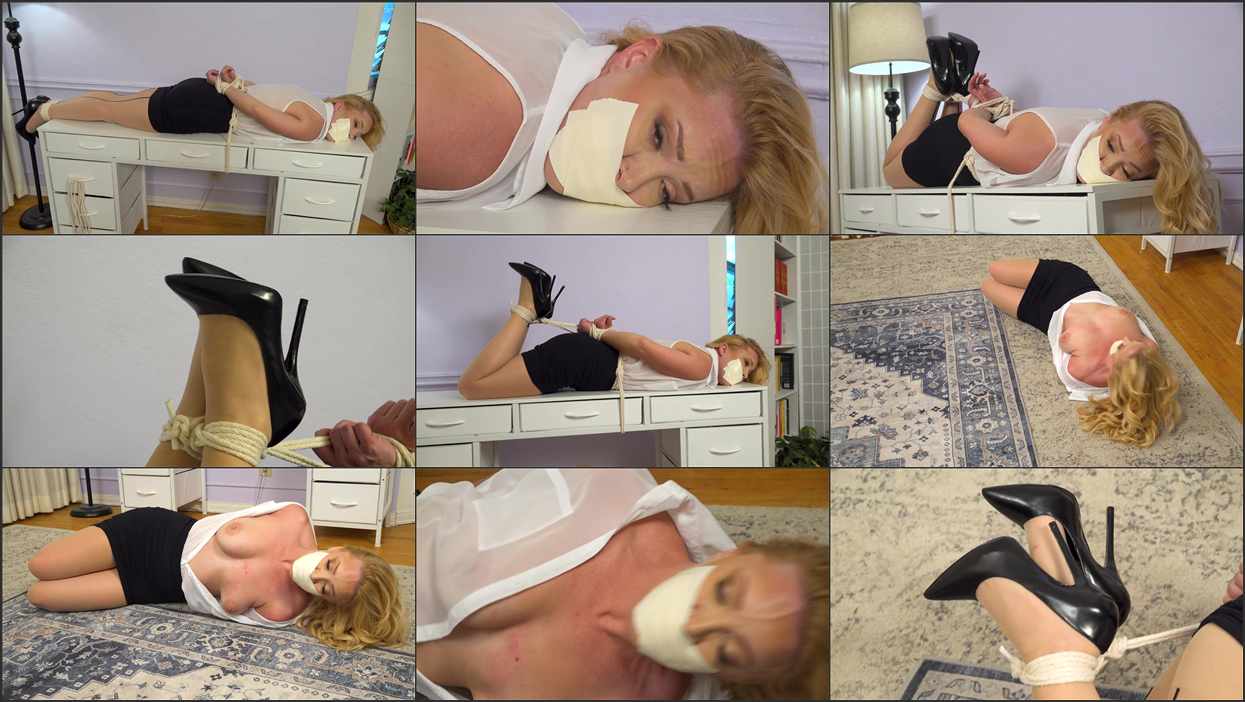 In the final scene of this POV fantasy, we learn that this entire adventure with Mandy Spears has all been a role-playing game performed in the empty office on a Saturday afternoon. Your boss is back in her sexy business-wear, and she’s tied down on top of her desk. She advises you it’s time to get her loose, as it won’t be long until the janitorial crew arrives to clean the office. But instead of untying her, you apply some microfoam tape onto her lips. You take a moment to savor her position and admire the sight of her shapely bound legs, looking quite fetching in her back-seamed pantyhose. Then you hogtie your boss-babe, enjoying her suspense about how close you’re going to play this game until the clock runs out. Then you move Mandy to the floor and open up her blouse to display her breasts, enjoying her struggling and moans. Will you free her in time to avoid an embarrassing discovery? Or do you have other plans for your boss?