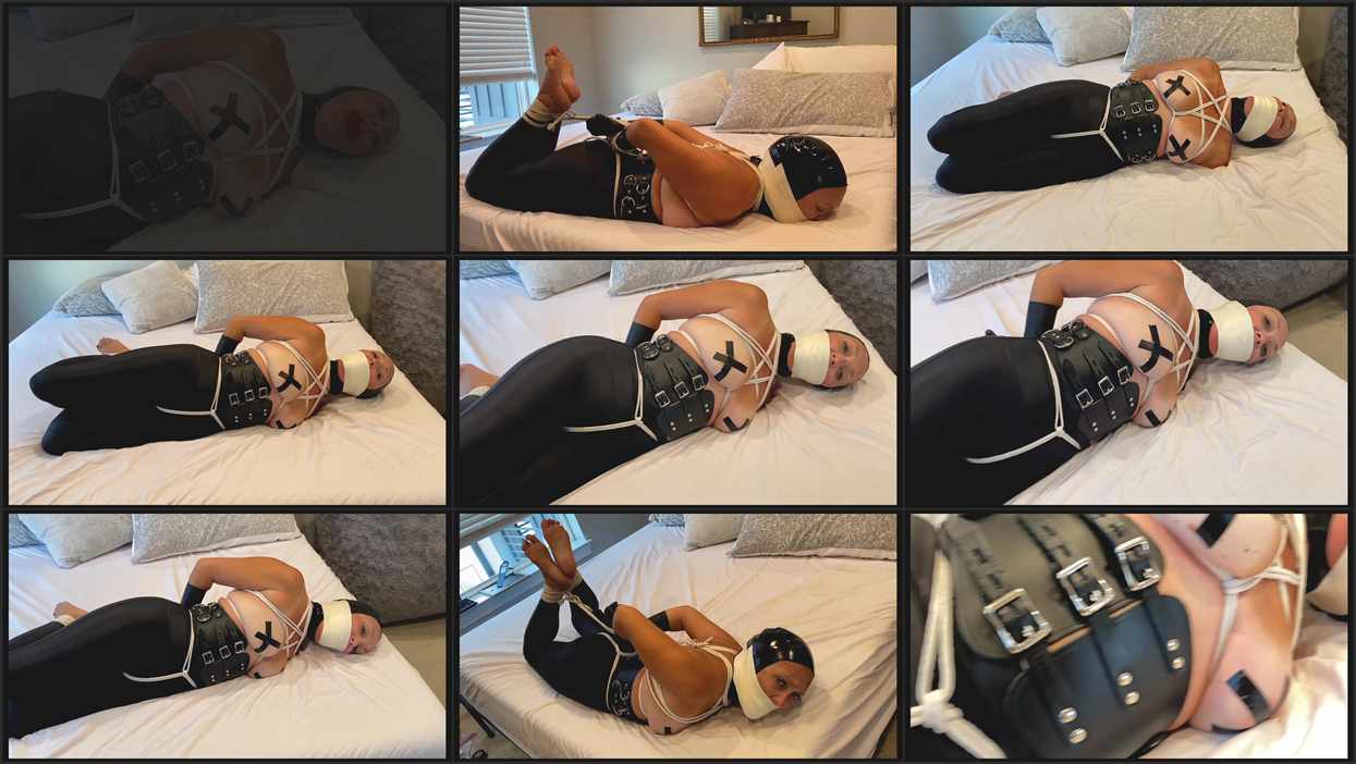 Captive Taylor spends the afternoon in very tight bondage. She’s hooded, stuff gagged with a wet bandana and microfoam wrap gag, confined in a cotton rope body harness, her nipples X taped, bound secure in rubber gloves to keep her from undoing the knots, in a leather bondage ring belt, tight crotch rope and hogtied barefoot on the bed.