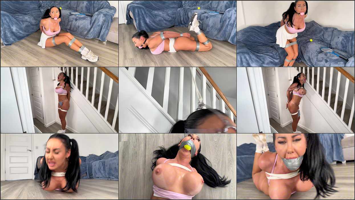 Mila is practicing her tennis skills when she accident knocks the ball over her neighbours. She doesn’t realise he’s a bondage fan and interrupts his wank! She heads over to ask for her call back and he’s ready for her. He offers her in to look for it. He’s placed it just where he wants it so he can carry out his plan! As she bends over he grabs her arms and covers her mouth “time to teach you a lesson”.