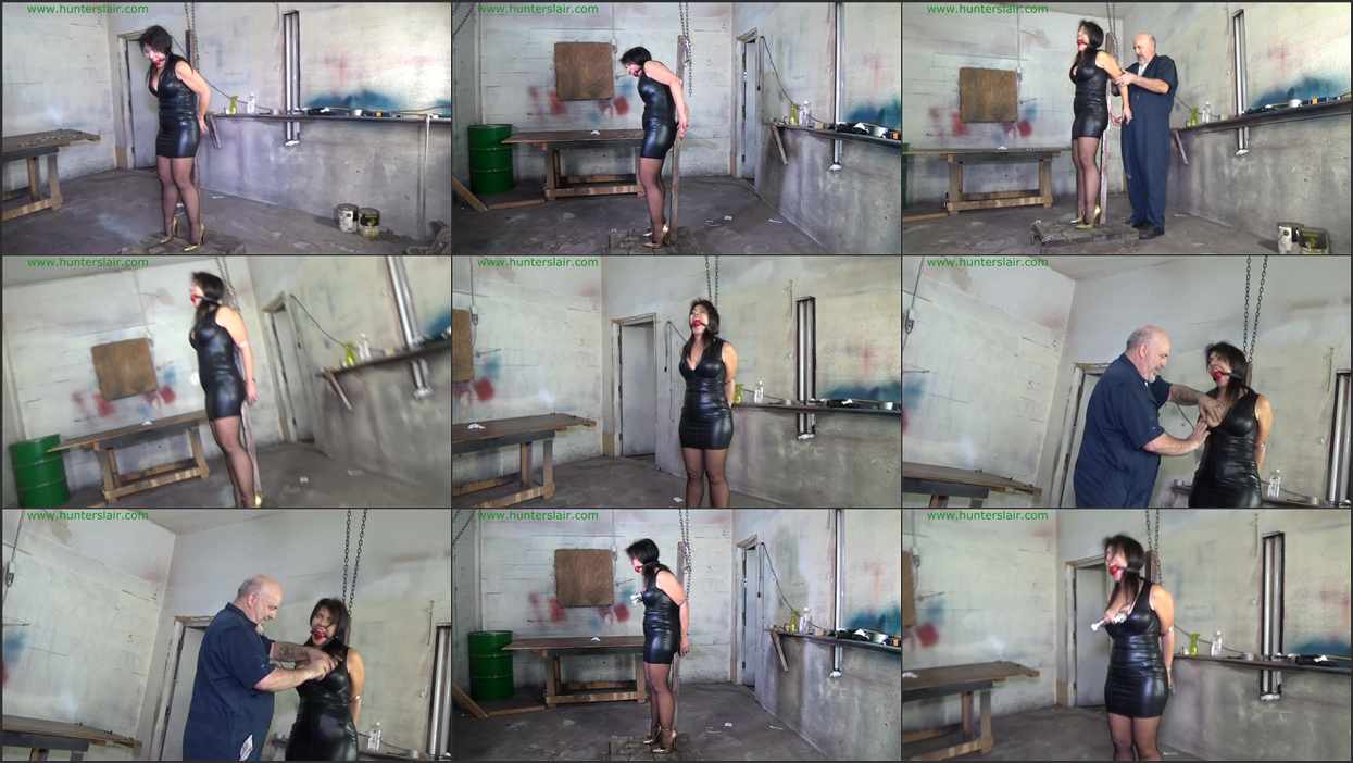 Hot sexy MILF Gigi stands at the post in the lair with a set of thumbcuffs biting deep into her thumbs behind the post. She screams and cries for help but with a black ball gag jammed between her teeth no one can hear her calls for help. No one that is except the Hunter who comes in with more steel cuffs. He locks a set of steel handcuffs around her elbows and then pulling her elbows close together behind the post he locks them tightly together. A set of handcuffs are then locked around her slender wrists. He then locks a set of leg shackles around her ankles, wrapping the chain between the cuffs around the base of the post. Gigi protest and complains through her gag as he pulls her tits out of her skin tight dress. He then attaches a set of breast vacuum tubes to her tits, Gigi screams in pain as her poor tits are sucked into the vacuum tubes. The Hunter leaves her sobbing and crying looking down at her poor tormented tits as they are pulled, stretched and swollen inside the tubes.