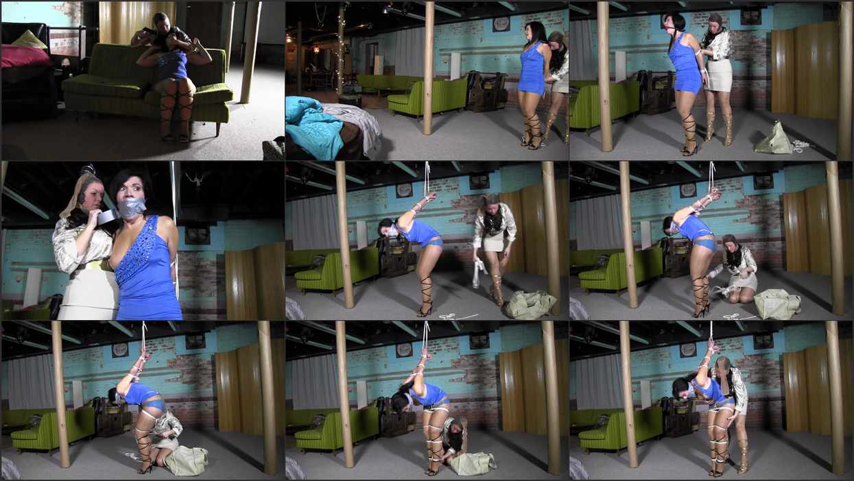 GG is dressed to in a little blue dress, shiny sheer hose and lace up stilettos. She pets herself on the sofa as she talks sexy to her lover. She can’t wait to see him. Unbeknownst to her his wife is nearby waiting for the right time to snatch her up and make her miserable. She wears a stocking cap but GG immediately knows who it is when she is grabbed from behind and weapon held at her head. She is forced to obey and tied up, her elbows smashed together. She gets ball gagged first, later duct tape is added to that. Her arms are pulled up high behind her in some kind of form of Chinese torture and the angry woman gropes at her and thrusts her hips into her. GG tries to talk some sense into her spewing that she was going to break up with the man that night. JJ is no fool, she doesn’t fall for it. She leaves GG there danging in that nasty strappado.
