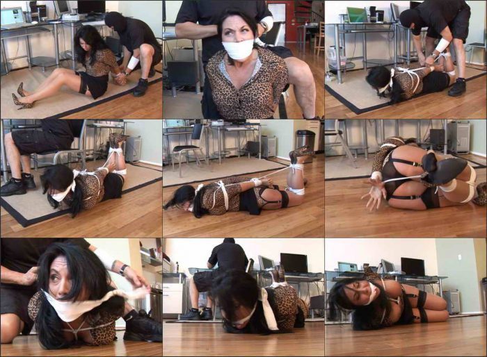 Gina Rae Michaels is working alone in her office one weekend when a masked man walks in and sneaks up on her. he grabs her from behind and covers her mouth with his hand. He then forces her on the floor and ties her up with rope. With the man still behind her, Gina demands that he un-tie her. She warns him that if he doesn’t, she will scream her head off. But before she can say anything else, a huge wad off cloth is stuffed in her open mouth. A rag is then tied very tightly over her mouth to gag her. With Gina Rae now hogtied and gagged on the floor, the man goes to her computer to download some company secrets…