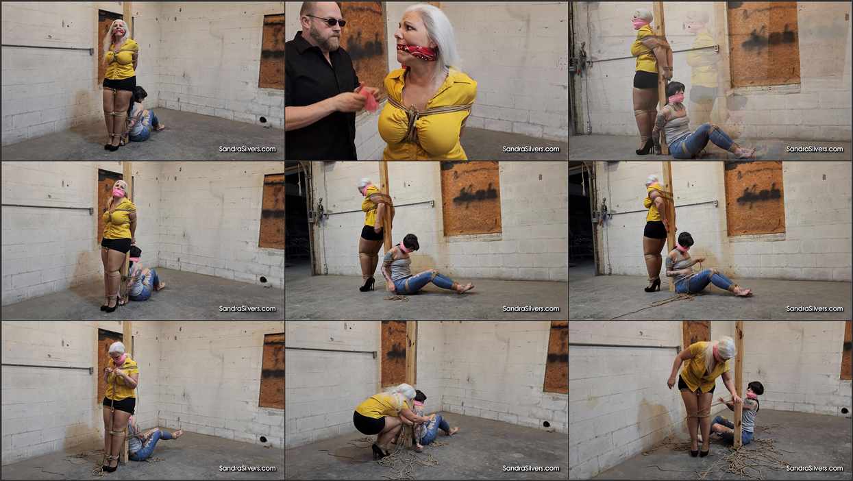 Observers note the live broadcast films Ben’s abrupt exit from the frame, abandoning the damsel duo, with a clear purpose from this perpetrator of predicaments. Left alone, Miss Hope, clad in jeans and a vest of cotton revealing the shape of perky breasts below, bare feet gripping with futility at the dusty concrete floor, appears to test her restraints aggressively. Meanwhile, Ms. Silvers – immobilized in a yellow silk blouse busting at the buttons across the broad’s ample bosom, pencil skirt clinging to curvy hips, and stamping her feet in frustration in her business-like high heels – leans into strategic shifts to avoid destabilizing her precarious footwear. The footage’s timestamp, blinking intermittently in the corner, confirms the scene is transpiring in real time, amplifying concerns among viewers.