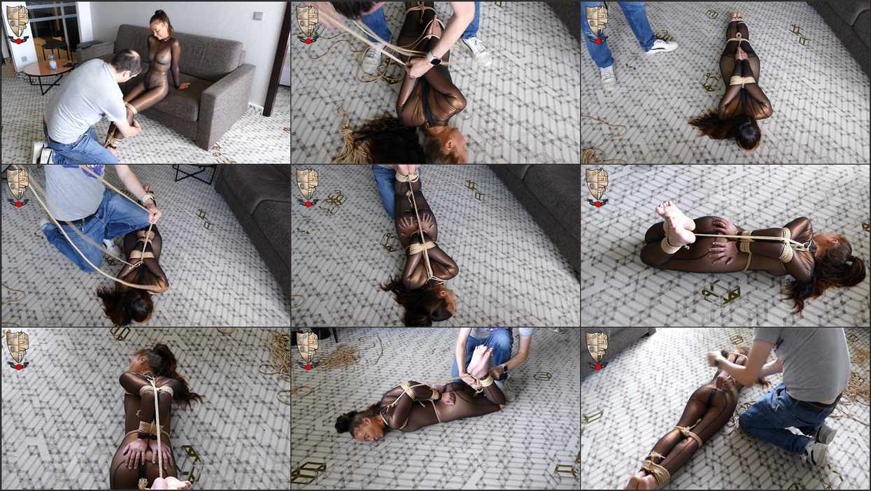 Mina Moreno, a sexy spanish bondage model is getting chickenwing hogtied in a copper mesh catsuit. She is a little bit shy but we got to know each other! How will she like it? Can she escape? It was a tough tie for her! Onscreen tying!