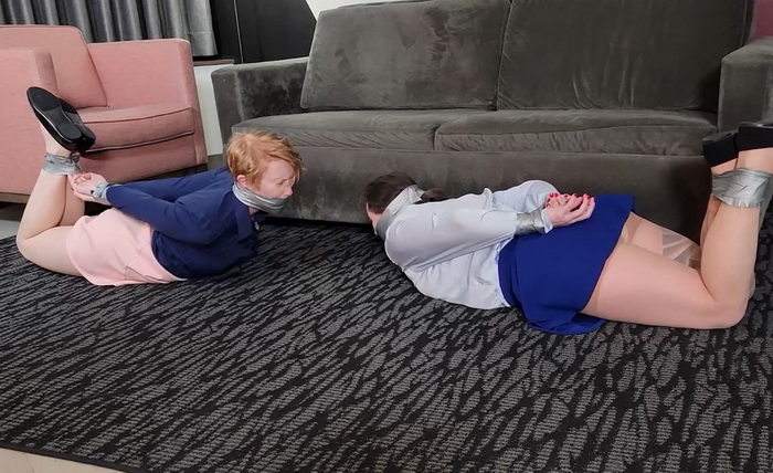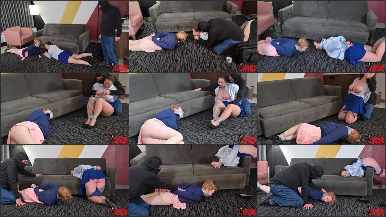 After a long day at church and witnessing for the Lord, all Minx and Izzabella wanted was to relax at home. Unfortunately for them, an intruder had other plans! He ordered the girls to lay on the floor and quickly bound them with tape, then gagged them by stuffing their mouths with dirty panties and wrapping the tape around their heads! Now secured and silenced, the girls struggled in fear, only to find their worst terrors about to come true! The intruder opened Minx’s blouse and began fondling and groping her big natural tits as Izzy could do nothing but watch. The intruder was not content to stop there, as his hands slipped into Minx’s pantyhose as he began to massage her crotch! Next she was bent over the sofa only to receive a series of blistering hand spanks. The only relief she received was even worse: the intruder spread her ass cheeks, burying his face between them! Izzy shrieked into her gag, wondering how much worse it could get, only to have her question answered when the intruder turned his attentions to her! Now the poor redhead was subjected to ass fondling and spankings as Minx looked on! The nightmare seemed to go on forever, with the intruder switching back and forth between the two helpless bound girls, but it kicked up a notch when the intruder yanked Minx to her feet and pulled her into the bedroom, leaving Izzy alone in her bondage. The humiliated redhead struggled and groaned into her gag, knowing her turn would be coming soon!