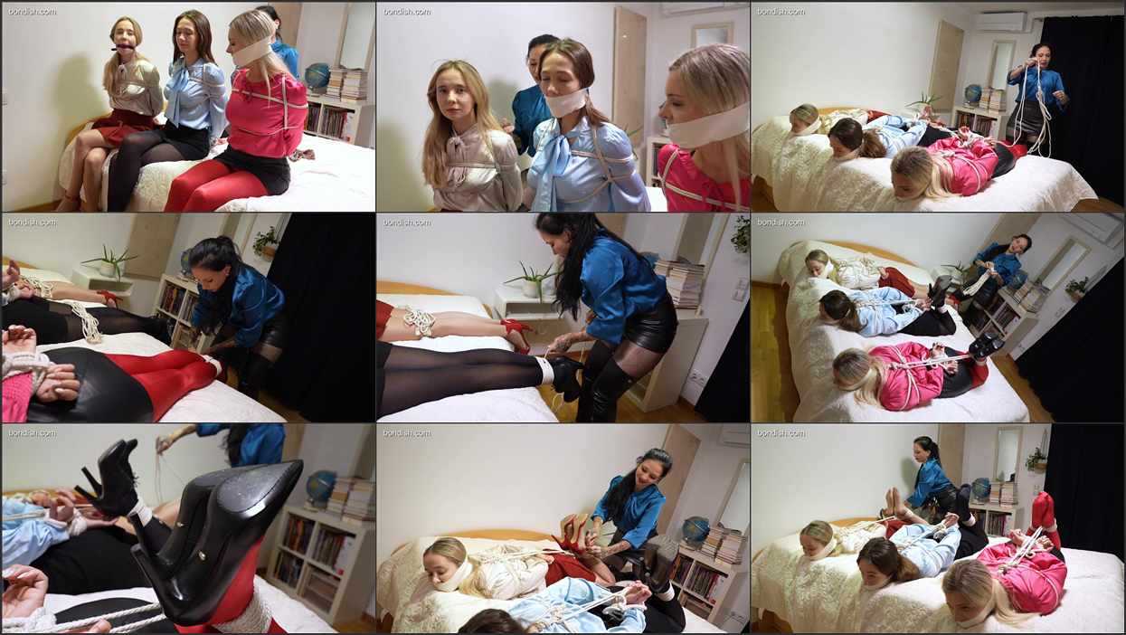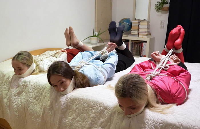 Mira has invited three friends to do what she enjoys most: tying up and gagging girls. Vera is already a bondage enthusiast, and her two friends Isabel and Jennifer have already had their first bondage session and are eager for new bondage experiences. After the girls have been gagged with ballgags and their upper bodies are properly ropes up nice an tight it’s time for the “Fun Part”. The girls get regagged with stockings and microfoam tape and afterwards they get hogtied. And Mira collects their shoes as a trophy before she leaves the party early.