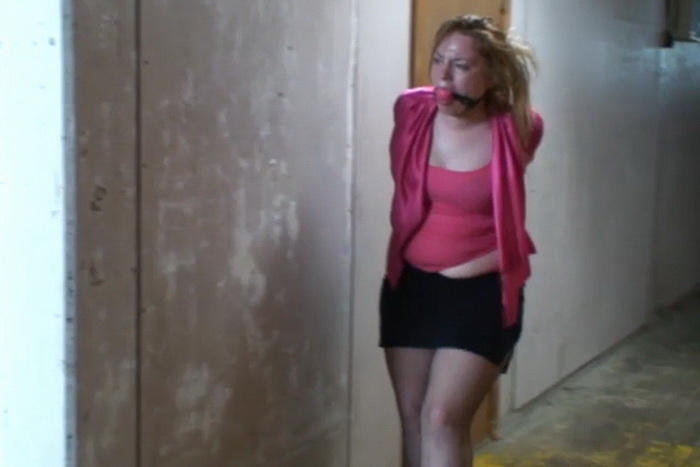 Molly wakes up on a strange bed with a spliting headache. She tries to move but realizes that someone has left her tightly bound and gagged on the mattress. Rope burn deep into her wrists, elbows and ankles as she struggles on the mattress. Molly moans into the tightly strapped ball gag jammed between her teeth. Looking around she sees some door and decides that she has to try to escape before her captor returns. She struggles to get her bound ankles up to her numb fingers to try to feel for the knots holding her ankles fast. After some frustrating tries she finally works the knots free and with more struggling the cruel ropes finally fall free from her ankles. But her arms are still helplessly and painfully bound behind her back. She hasn’t time to try to find something to try to cut the ropes free so she runs to the door. But it is locked and deadbolted. She tries a second door and after some effort with her bound hands she manages to open the door. Now what the door leads to a warehouse, Molly tries a few door thinking that they might lead to an exit but all the other doors are locked tight. So she heads deep into the gloomy warehouse seaching for an exit.