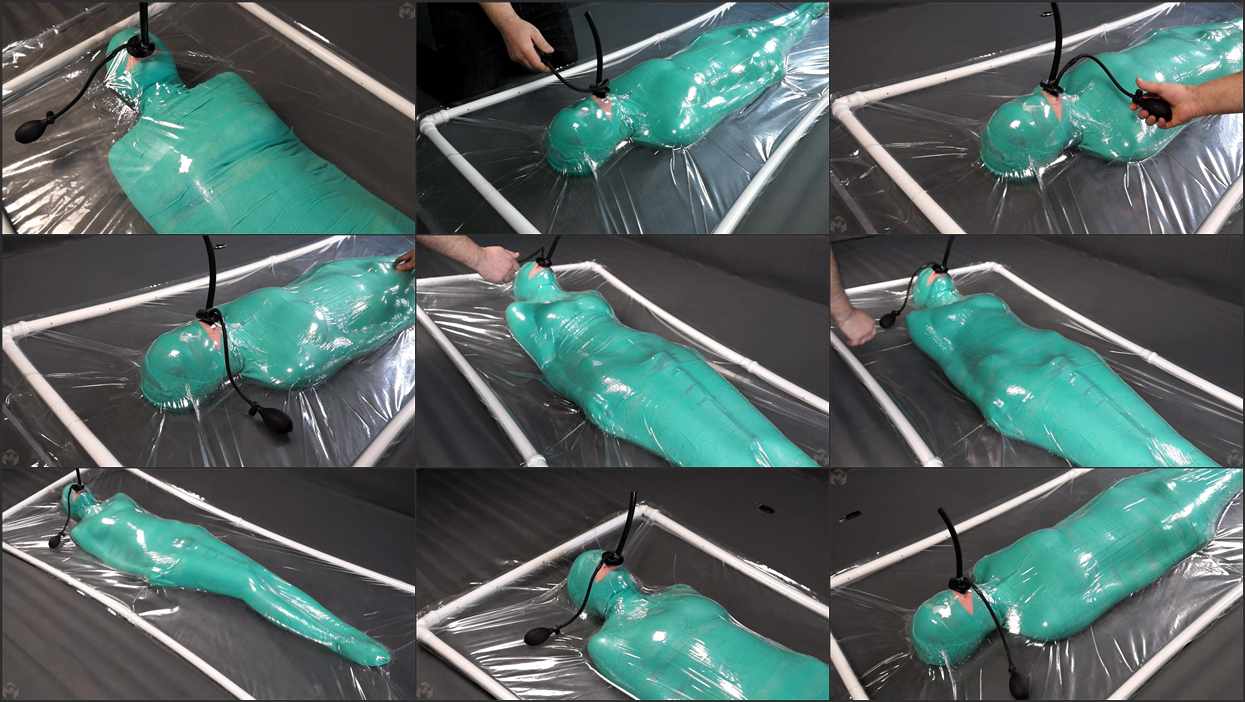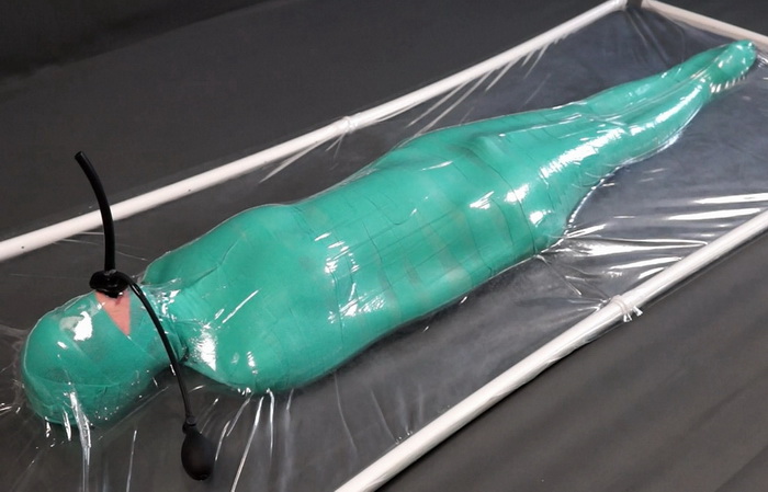 Sonya is mummified in a green elastic bandage, a vibrator constantly stimulates her, and an inflatable gag stretches her mouth! And all this happens in a transparent vacuum bed.