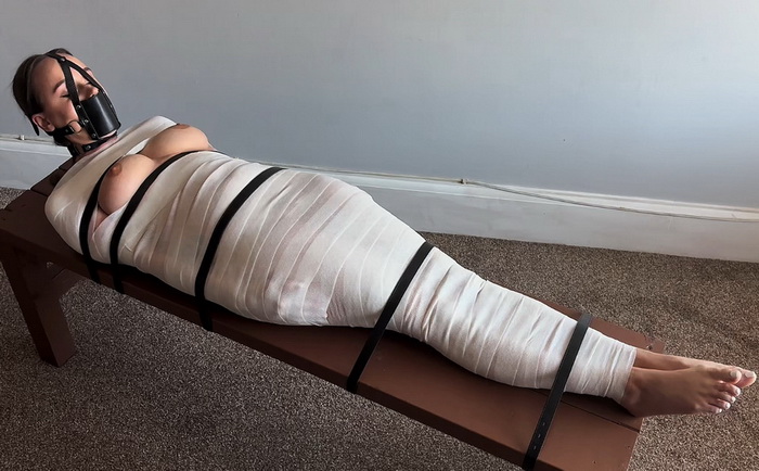 I’m tightly secured in mummification, layers of vet wrap holding me in place before I’m belted down to the bench. The bondage keeps me completely restrained, my body unable to do more than small movements as I start struggling against it, testing how tight everything really is while I stay harness ballgagged.