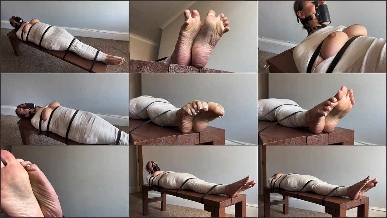 Wrapped, bound, and struggling in this mummification bondage, I’m helpless and exposed, my bare feet on show the entire time while I remain harness ballgagged and fully restrained.
