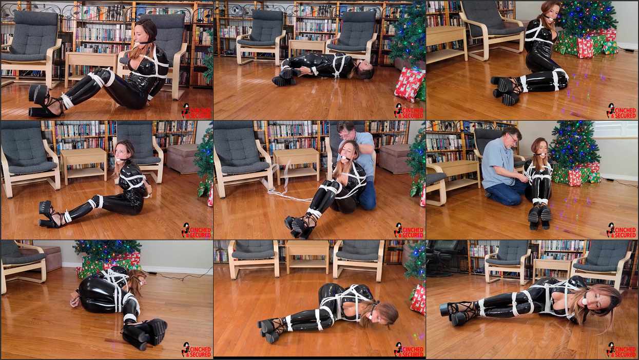 Christmas brings out the good in most people, but there are evil folk who use the holiday to spread misery while profiting for themselves. Cat burglar Mya Pleasure was one such person, breaking into homes across the city and stealing the gifts that had been left for Christmas morning. Unfortunately for her, THIS house was ready for her, and the homeowner gagged her and tied her up to end her spree! Clad in a skin tight latex catsuit, she was very tightly bound with endless coils of gleaming white rope, her suit unzipped to expose her big boobs and her mouth filled with a ball gag that kept her helpless, quiet and drooling! As she squirmed and writhed in a useless attempt to escape, the saliva slid down her chin, coating her gorgeous tits! The homeowner returned with MORE rope and soon the beautiful burglar was folded and compressed into a tight ball and left twitching on her side! There was DEFINITELY no way to escape, and Mya began to dread choosing a catsuit with a zippered crotch! She had a hunch that soon she’d be stuffed like a Christmas turkey!