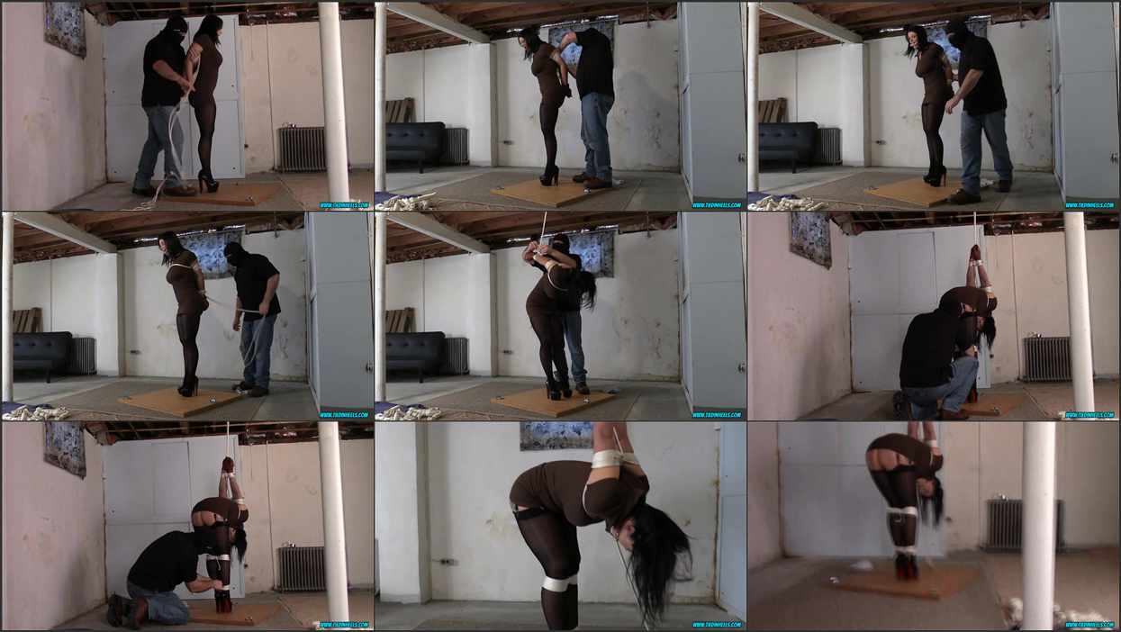 Nadia is brought into the dungeon already gagged with a wooden bit gag! Her arms and wrists are quickly and cruelly tied tightly behind her back! Her endurance will be tested tonight! She is helpless as the ropes are tightly applied! She is strung up into a strict strapaddo! Then her thighs and ankles are tightly bound together! Poor Nadia can only struggle and teter on her high heels! A sexy blindfold is added to keep the beauty in the dark! It doesn’t matter, she is our and she will not be going anywhere for a very long time!