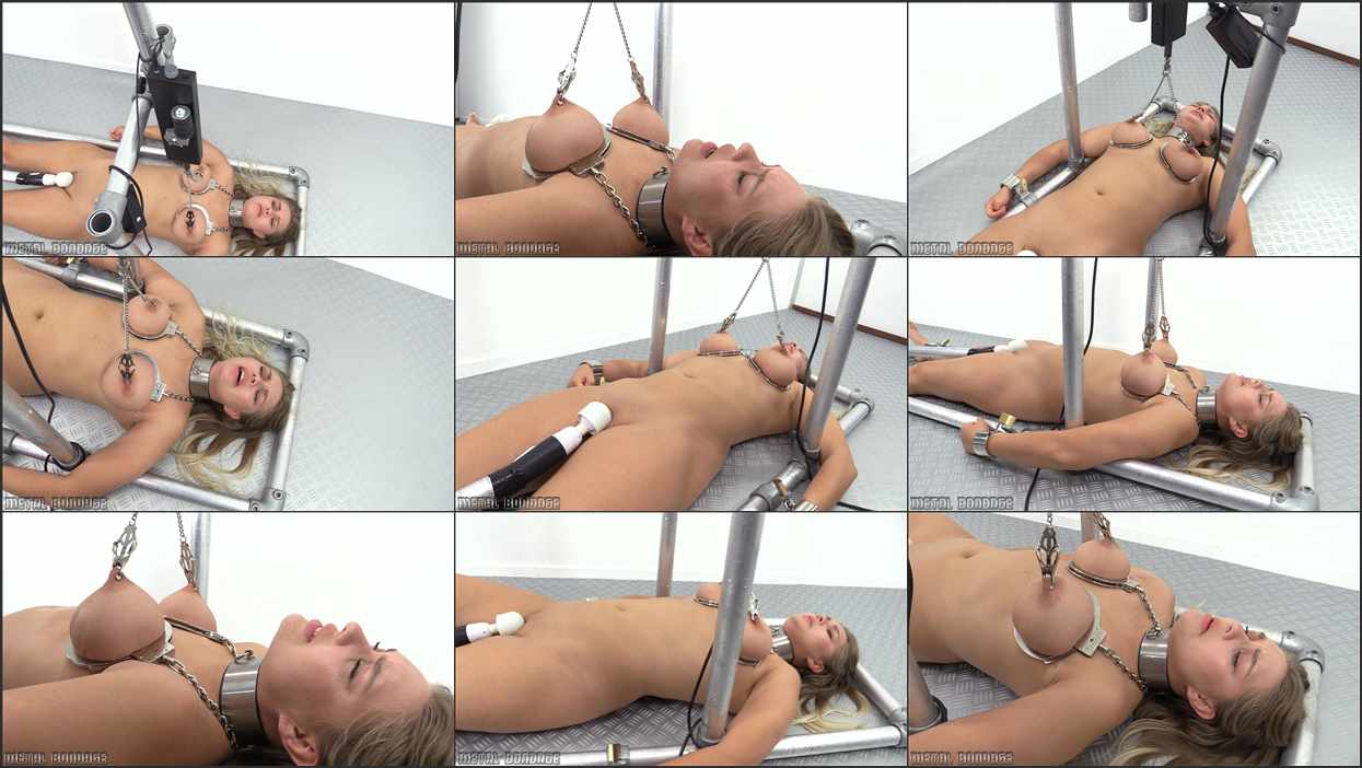 Denise! My local model is such a perfect submissive. She gets a lot of boob and nipple training, because members request it so much. Boob cuffed, Denise is lying on the cold floor, secured to a steel pipe frame. The nipple puller machine will work on stretching her nipples, while I have fun playing with the speed control of the machine…