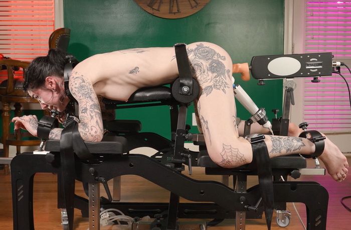 The wand is turned on, slowly ramping up over time, as her moans grow louder and louder, as the orgasms begin hitting her. The dildo of the fucking machine is shoved into her hole, while the machine is turned on and ramped up in speed over time to yield even more orgasms from her.
