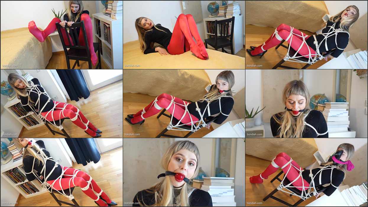 Nana is wearing a brand new pair of tights from Wolford. Bright red satin De Luxe silk tights. Classy. Expensive. And with a real seam on the back. Nana is also wearing a corset from Wolford. Now for the session: First, you get to admire Nana’s feet as she lounges on a chair for you. But she will soon be tied to it with lots and lots of rope. Then a ball gag and finally a shoe gag.