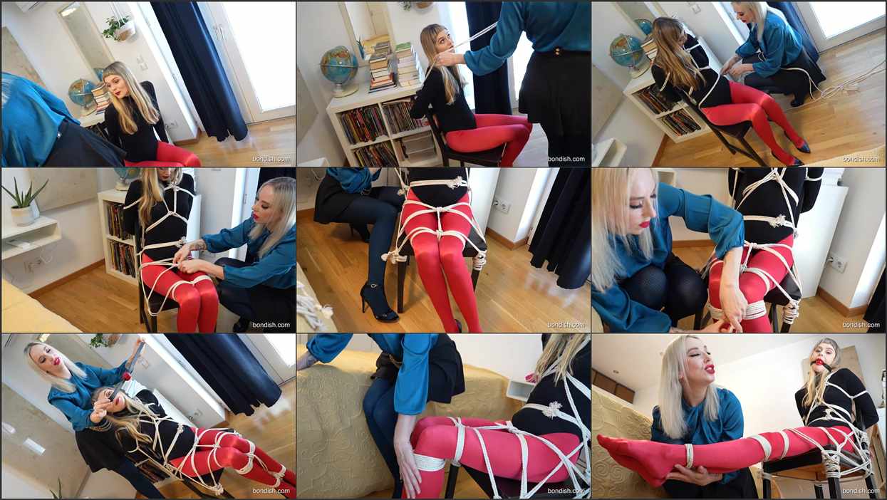 Nana wants to show Naomi her beautiful new Wolford stockings. Naomi thinks they’re so beautiful that she HAS to tie Nana up in them! So she quickly grabs eight ropes and ties little Nana to a chair. And to match the red tights, a red ball gag. Yes! Now just take off Nana’s heels, put a gag in her mouth, and Naomi can show you Nana’s feet. Aren’t they beautiful?