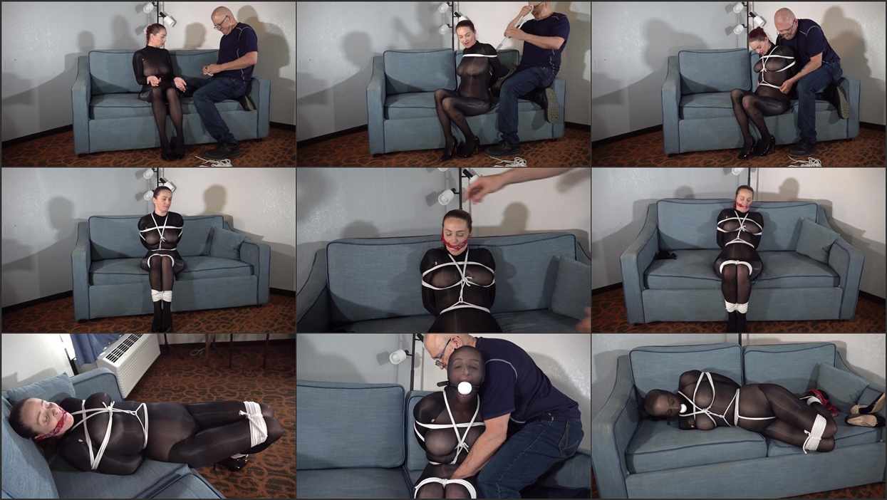 Natalie called him to her place, and when he arrived, he found her in a black nylon body suit. She tells him that she wants to do something kinky, so he ties her up and gags her. Later, he completely encases her, and stuffs a ballgag in Natalie’s mouth.