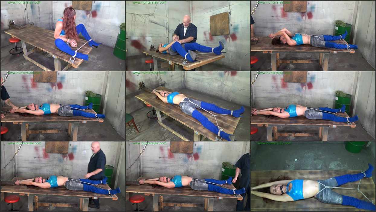 The Hunter has his pretty neighbor Nicole tied to his table with her booted ankles spread and attached to a set of ring mounted at the sides of the table. Her wrists are bound at her waist tethered to her crotch rope to keep her from reaching the ball gag jammed between her teeth or the knots holding her ankles to the ring. But Nicole isn’t one to give up easily, she struggles to sit up and bends her knees to pull her hands closer to the rope holding her ankles to the ring. She stretches and reaches with her nipple outstretched finger for the knots but they are just out of reach, she can just barely tough the ropes with her fingertips. While struggling to loosen the knots with just her fingertips the Hunter walks in to catch her. He sees that she needs to be punished and frees her bound wrists from her crotch rope. Nicole’s hands are pulled up high above her head and attached to a chain running up to a winch mounted high above her head. The while Nicole struggles with her hands overhead the Hunter runs the rope from her crotch rope down to the rope tethering her ankles to the rings. He then turns the winch above her head which pulls and stretches her tight little body out across his table. As her wrists are pulled higher and tighter the rope between her legs is also pulled tighter and deeper into her skin tight jeans, splitting her pussy in two. Nicole begs and cries into her gag as her limbs are pulled and strecth taut. The Hunter leaves her to struggle on his rack. He returns to crank the winch even tighter until Nicole’s poor body is stretched to it’s limits and she can barely move, her lungs are compressed as she struggles to breath and the crotch rope slices brutally deep into her skin tight jeans. Nicole begs and cries between breaths but he leaves her alone to suffer in the brutally tight ropes.