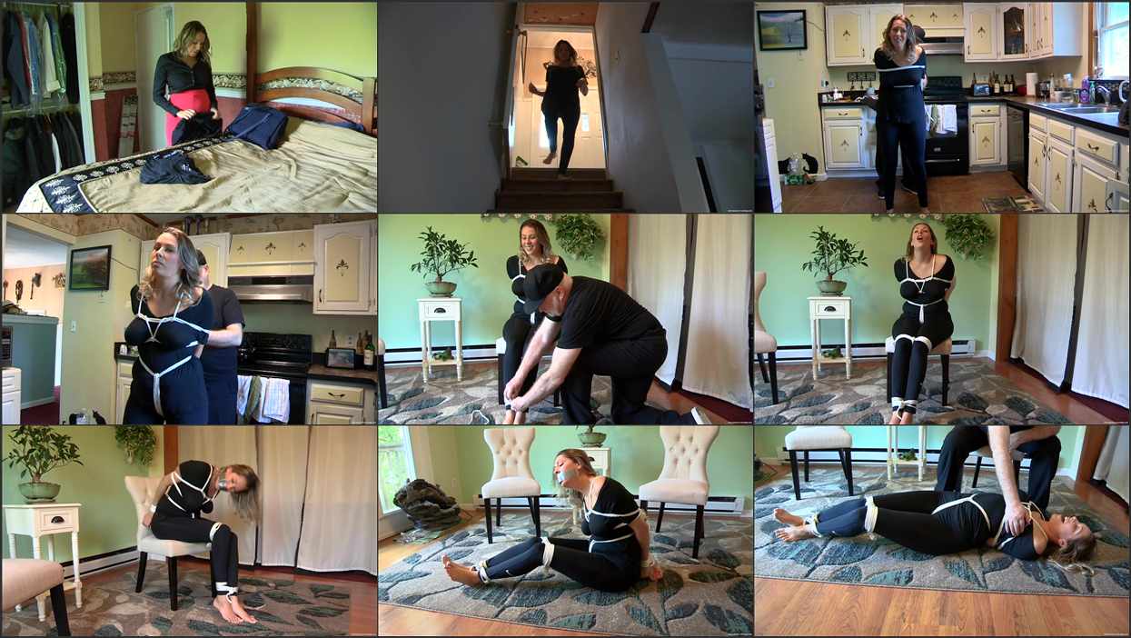 Nikki arrives home from a long and tiring day at work. She goes to her bedroom and changes out of her business clothes into leggings and a comfy shirt. Just as Nikki starts to unwind, when a man surprises her and ties her up, tying rope around her chest and applying a crotch rope, pulling on it to make Nikki react. By the time he sits his victim on a chair to tie her legs, Nikki has discovered that she actually likes being tied up and asks the intruder to tie the ropes tighter. Surprised by her acquiescence, the man complies. He tape gags Nikki to keep her from raising the alarm while he goes in search of cash and valuables, even though by this time Nikki displays no desire to summon help or be freed. She lowers herself from the chair to the floor and waits for him to come back. When he does, she gestures for him to remove the gag. She thanks him and asks him if he is free to do this again on Saturday. Realizing his luck is in, the man enjoys a little sample up front and gropes Nikki’s ample breasts. She does not mind at all and squirms in pleasure. When the man departs he does not bother to untie her, telling her to get herself free.