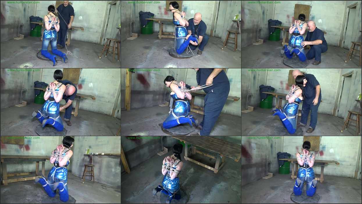 With her arms twisted up high behind her back in a cruel reverse prayer, raven hair Nyxon is dragged into the lair by her crotch rope. She is wearing skin tight jeans tucked into blue over the knee boots and a bright blue shiny top. A big black ball gag that spreads her jaws painfully open is jammed between her teeth. The Hunter pushes her down onto her knees facing a short metal post on his girly-go-round, the crotch rope is attached to a ring at the top of the post and pulled tight. He then frogties each of her legs with her booted ankles tied to her thighs with her stiletto heels digging into her denim covered ass. Nyxon is pulled up onto her knee points supported by her crotch rope. The Hunter then wraps more ropes around her arms, just above her bent elbows and jerks her elbows close together at the small of her back. Nyxon grunts and cries in pain as her hands are pushed up high between her shoulder blades to the back of her neck as her elbows are cinched tightly together. The Hunter spins her around on the platform and leaves her alone to struggle helplessly on the knees, her arms totally useless to her twisted up behind her back.