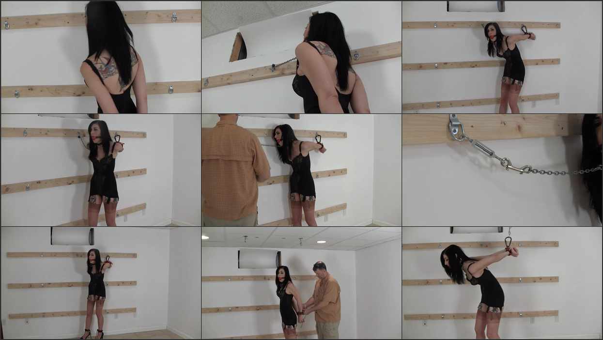I start by leading Nyxon into the basement and anchor her collar chain to the wall. Handcuffed and helplessly tugging against the short chain I can’t help but think how hot that ballgag looks between her lips. Still, there’s no such thing as ‘too’ helpless and before she knows it her arms are pulled up behind her, locked to the wall. With her arms stuck in a strappado I modify her collar chain to make it even tighter. Now that I have her completely vulnerable… what else can I do!