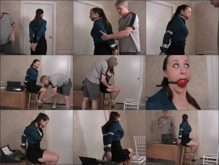 Serene Isley walked into the office of Mr. Big Boss wearing a blue blouse; black pencil skirt and sling back pumps. The Boss greeted her with a ball gag in his hand and explained to her why she is visiting his office today; for some typing training. He then shoved a huge red ball gag in her mouth and finished explaining what exactly the training involved. The boss then grabbed some rope and started to tie Serene’s wrists together tightly. He then moved onto her elbows. He pushed them together until they touched and then cinched them together as tight as he could. The boss teased Serene about upping the difficulty of the typing test by tying her hair to her elbows. She didn’t seem too receptive to the idea. He instructed her to sit on the stool beside the desk and he started to tie her ankles together…