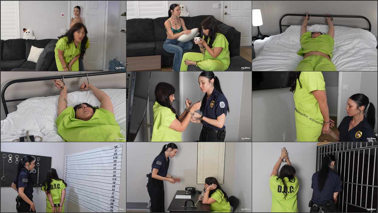 Officer Kiia is enjoying a day off, taking cute mirror selfies in her lingerie when she hears a knock on the door. She quickly throws a pair of jeans on and opens it to find Mackeni standing there, in a neon green jumpsuit and with transport chains and shackles. Mackenzi makes her way inside asking Kiia for help, not realizing she’s an off duty police officer. Kiia offers to make her a drink to help settle her nerves, and she walks away to make the drink. Mackenzi keeps panicking about her situation when Kiia brings her a mug. After a few sips Mackenzi settles, and ends up resting. Mackenzi awakens handcuffed and shackled to a bed. Confused, she struggles against the cuffs, wondering how she ended up in such a predicament when moments ago she was enjoying a drink and looking for help. Officer Kiia walks in and joins her, this time dressed in her uniform. Mackenzi is shocked to realize she asked for help from the exact person she should have been avoiding after her escape. Kiia removes her from the bed and has her stand facing the wall, preparing to put Mackenzi in a lock box with a waist chain and connected shackles. She leads her out of the room, ready to take her back to jail…